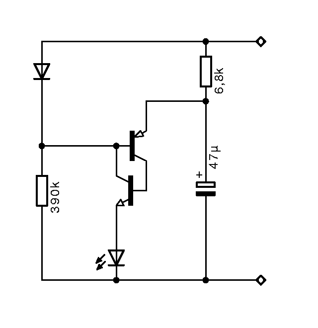 Der Ladekondensator wird über den 6,8 kOhm Widerstand allmählich aufgeladen. Der 390 kOhm Widerstand zusammen mit der Diode (einziger Ruhestrom der Schaltung) bietet dem pnp-Transistor ein Vergleichspotential an seiner Basis. Wenn der Spannungsabfall über dem Ladewiderstand sehr gering wird, steuert der 390 kOhm Widerstand den pnp-Transistor durch. Dessen Kollektorstrom wiederum steuert den npn-Transistor auf, der seinerseits den pnp-Transistor ebenso weiter öffnet. Es entsteht ein Lawineneffekt (Pseudo-Thyristor), so daß der Kondensator innerhalb kurzer Zeit über die LED entladen wird: ein kurzer Lichtblitz entsteht. Am Ende des Blitzes schließt der Pseudo-Thyristor wieder, und der Vorgang beginnt von neuem. Thomas Prinz hat mir den folgenden Link ins Elektronik-Kompendium nahegelegt, der den Thyristor-Effekt näher erläutert. Dort finden sich noch weitere Links zu Thyristoren allgemein, auch sonst ist das ElKo eine gute und empfehlenswerte Informationsquelle. Die genannte Dimensionierung soll lediglich Anhaltspunkte liefern. Logischerweise bestimmt die Kapazität des Kondensators zusammen mit der Spannungslage der Batterie die Intensität des Lichtblitzes. Der Ladewiderstand bestimmt wesentlich die Blinkfrequenz, zusammen mit dem Kondensator. Der 390 kOhm Widerstand soll einerseits so gering wie nötig sein, daß die Schaltung gerade noch funktioniert (da er ja den Ruhestrom bestimmt), andererseits muß er so gewählt werden, daß die Schaltung im gesamten gewünschten Spannungsbereich noch arbeitet. |